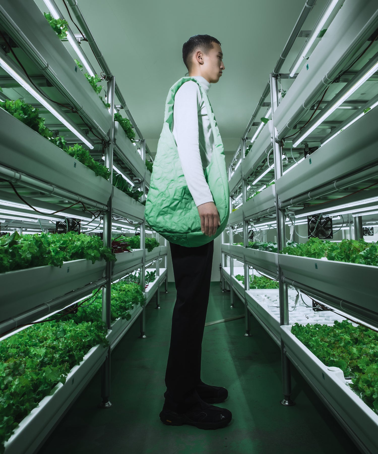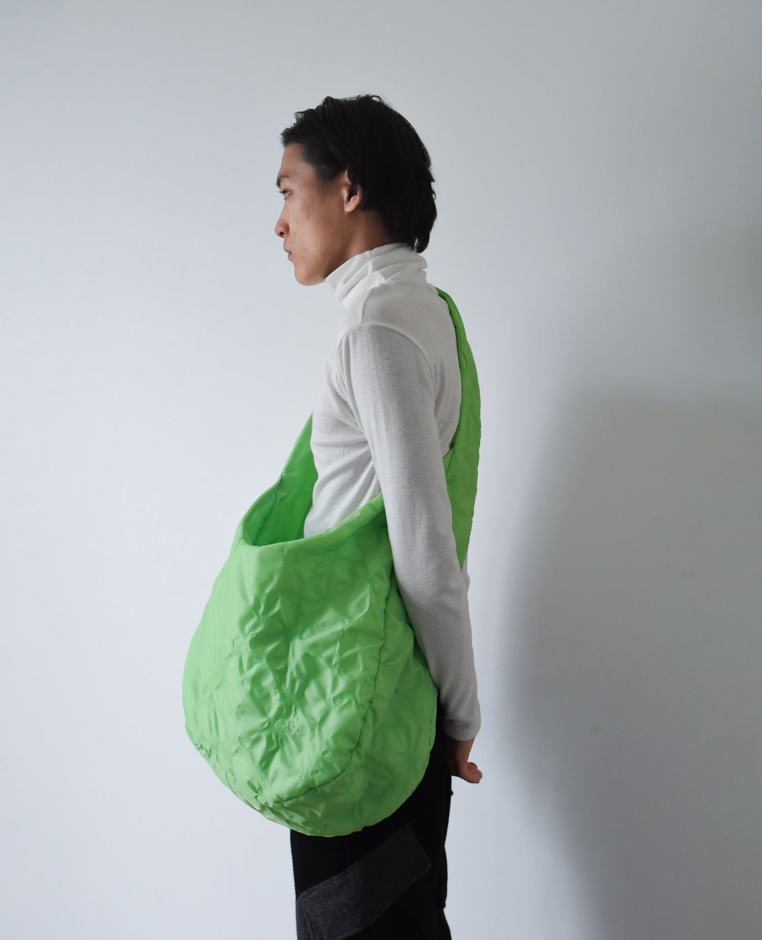 バリスティックナイロンに熱を与え表面加工が行われたオリジナルファブリック。 22AW のテーマ、バイオフィリアに基づいて葉脈を表現されています。
