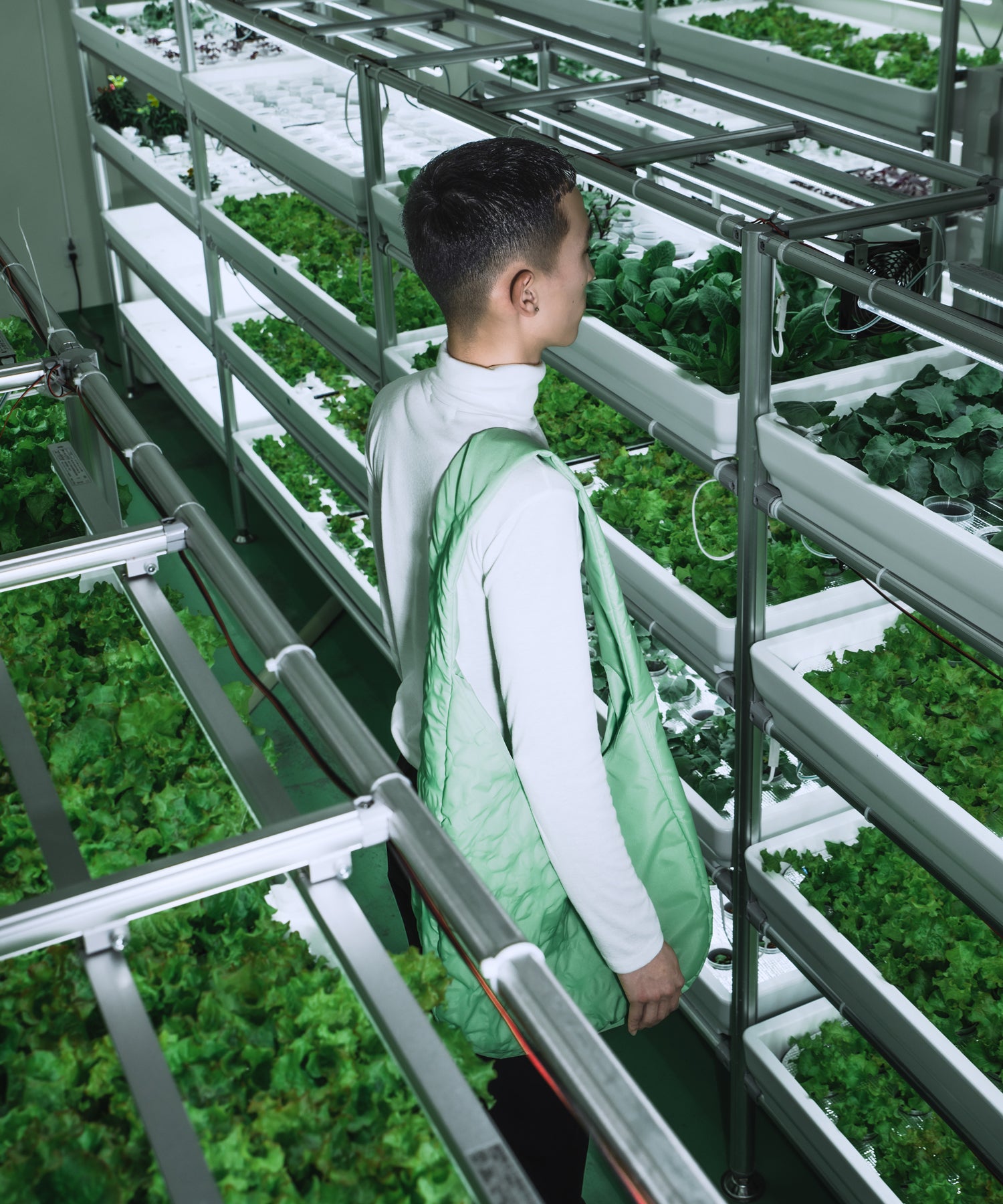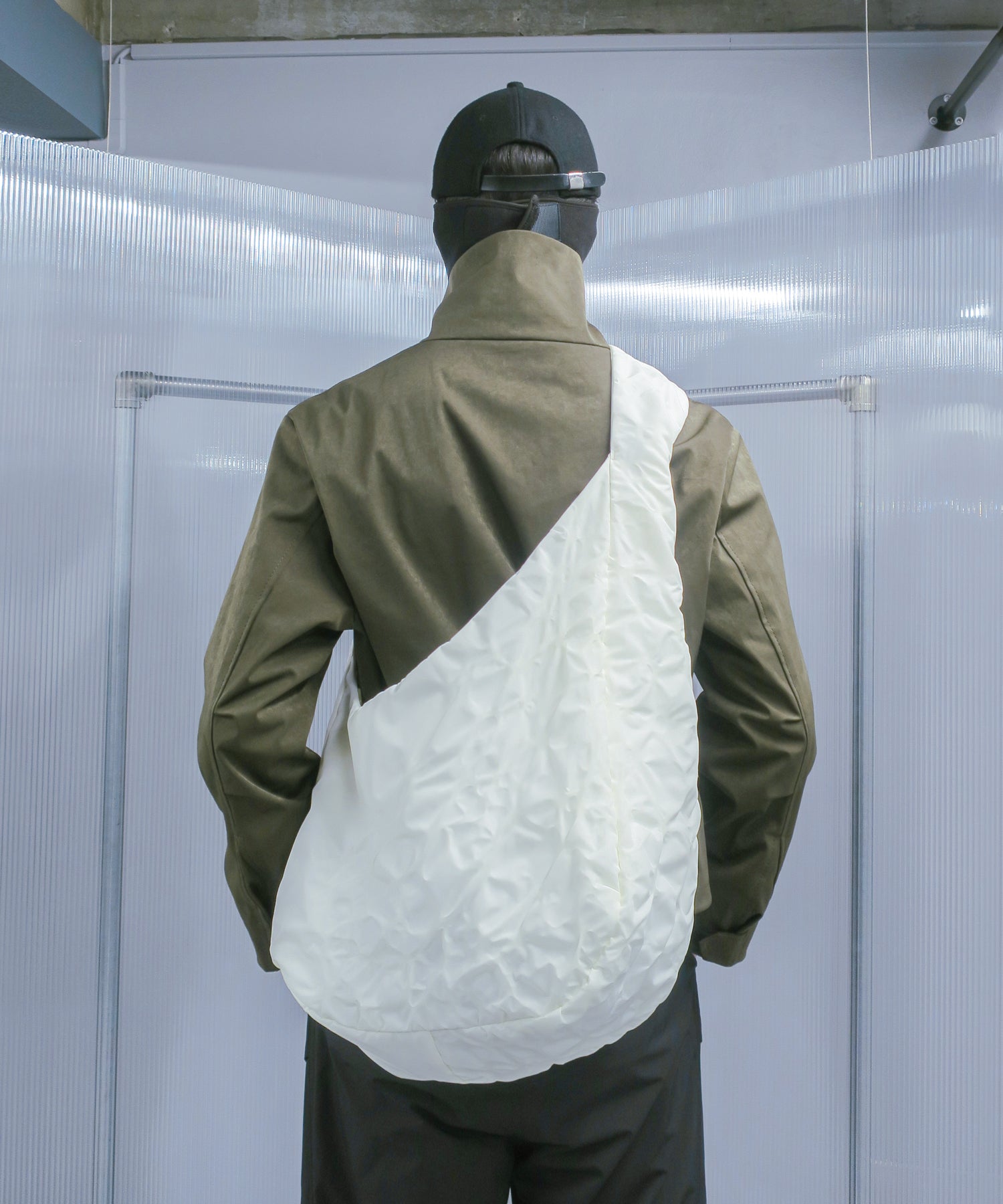 An original fabric that is surface-treated by applying heat to ballistic nylon. Leaf veins are expressed based on 22AW's theme, Biophilia.