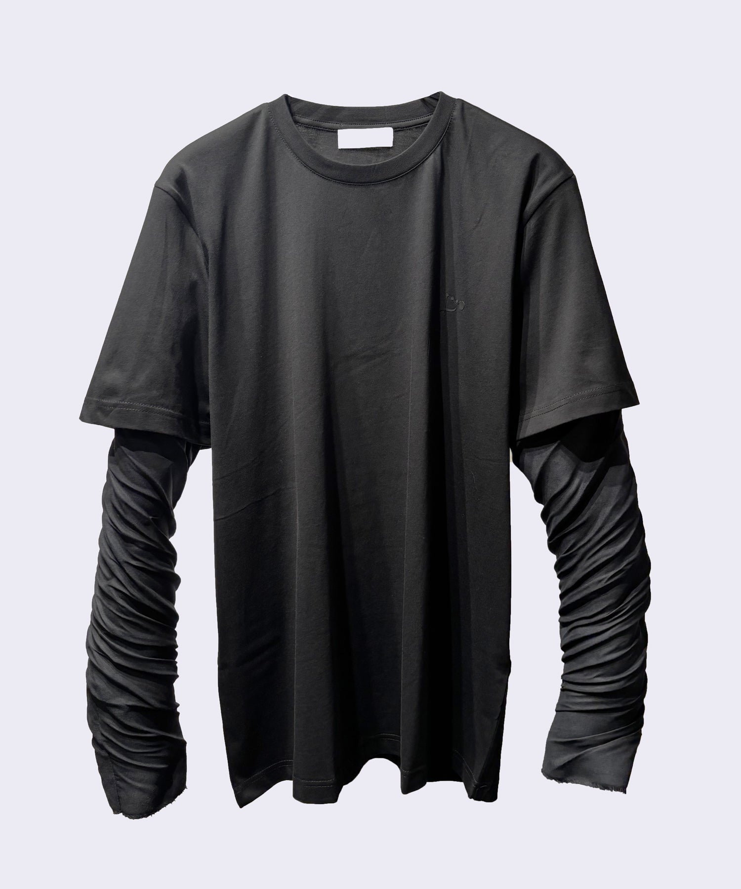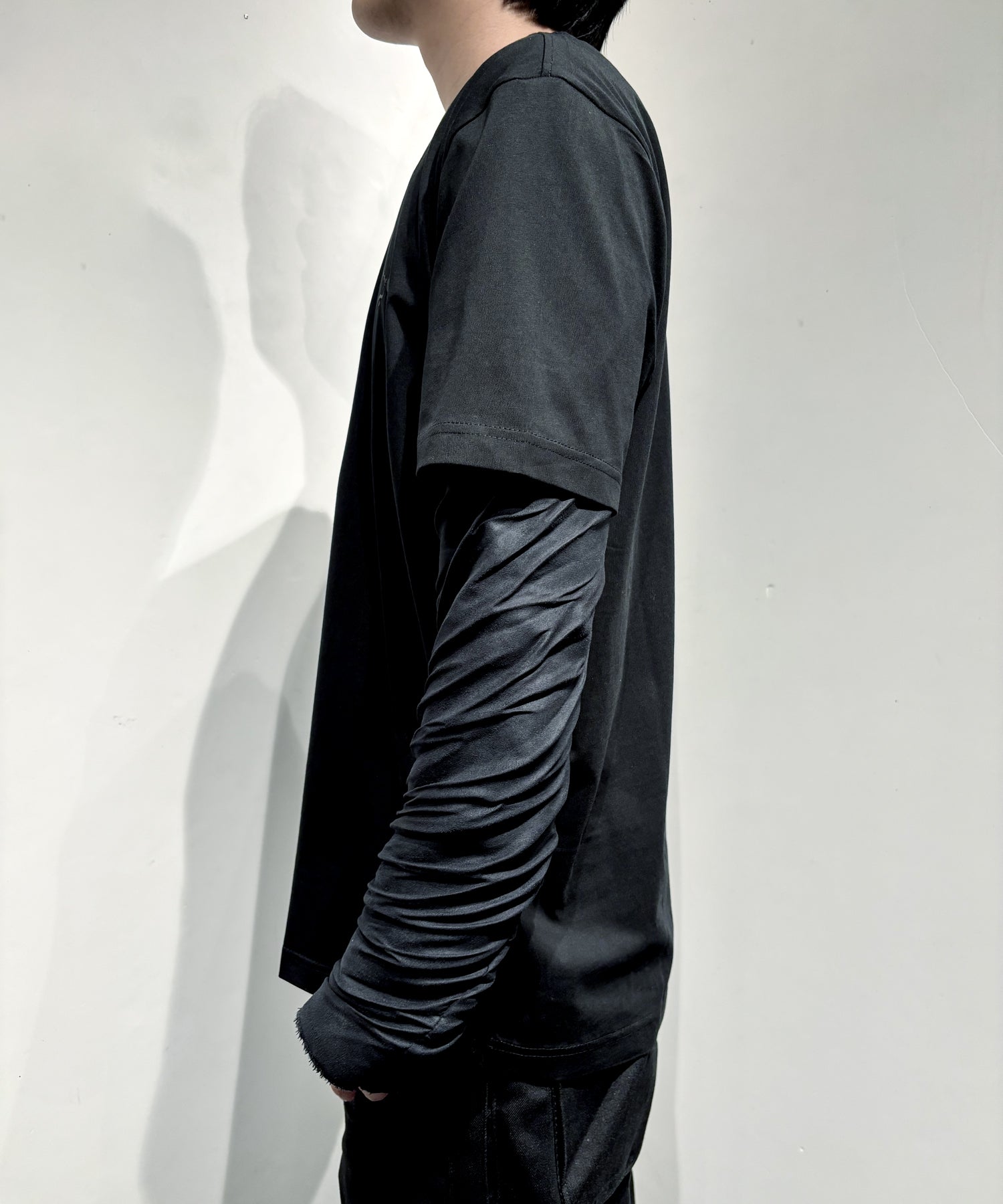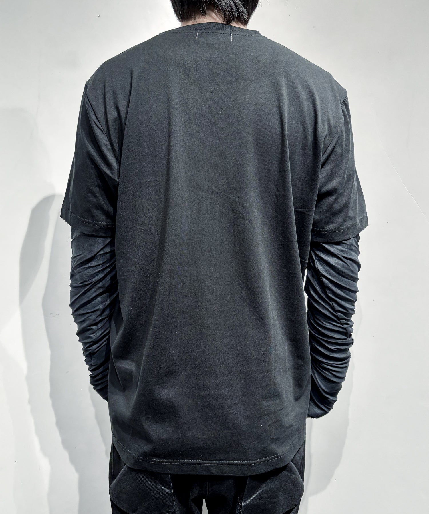 アームパーツにスパイラル状の脈加工を施したレイヤードTシャツ。