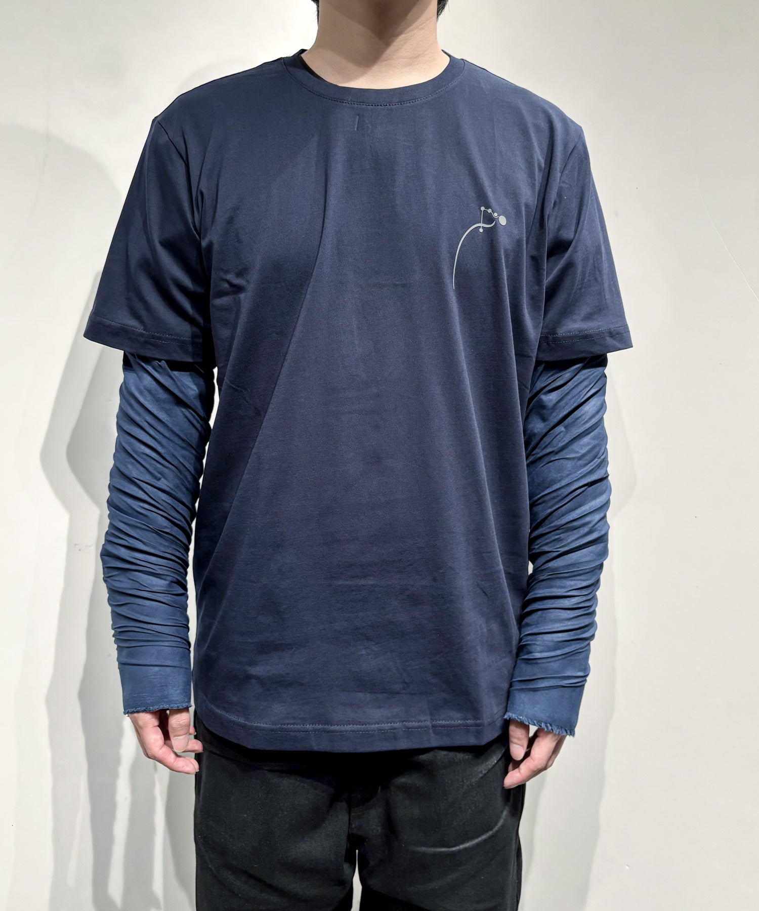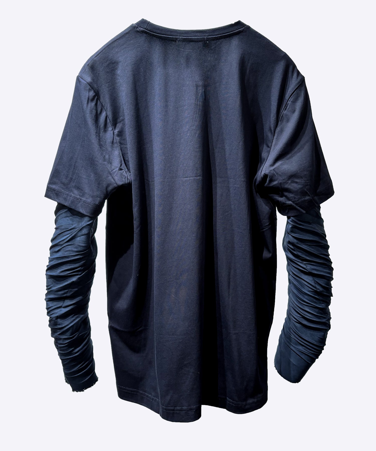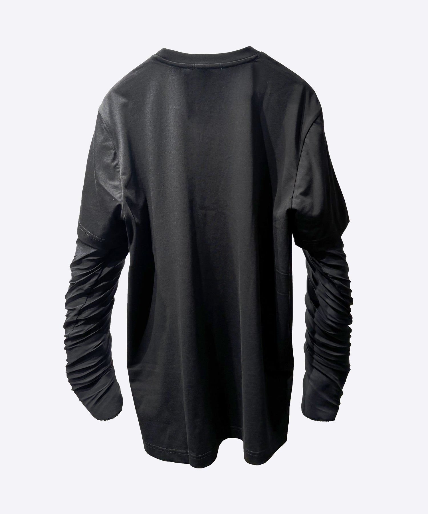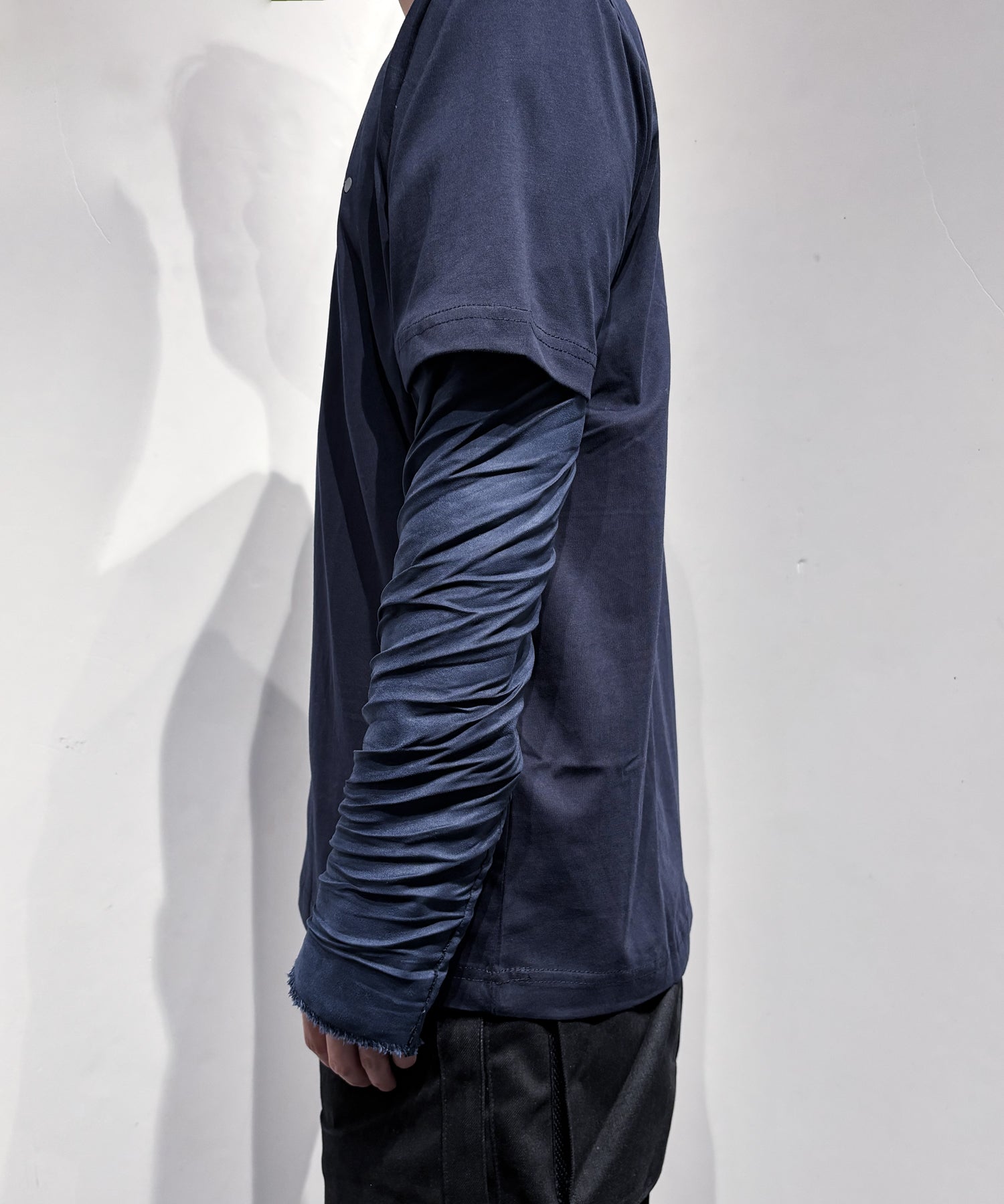 アームパーツにスパイラル状の脈加工を施したレイヤードTシャツ。