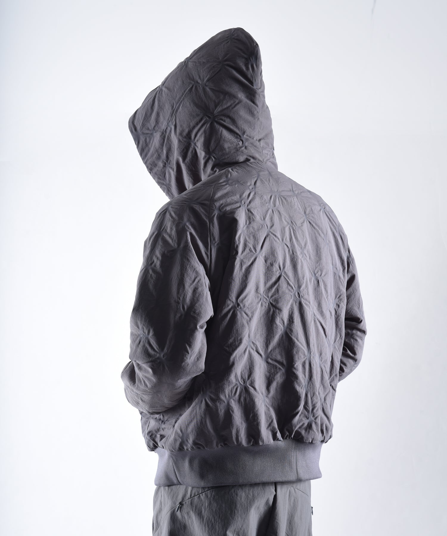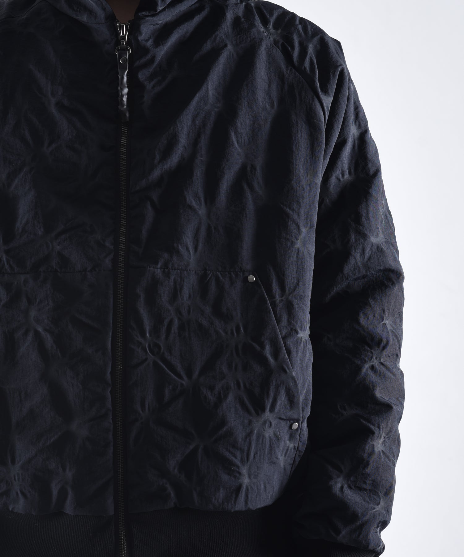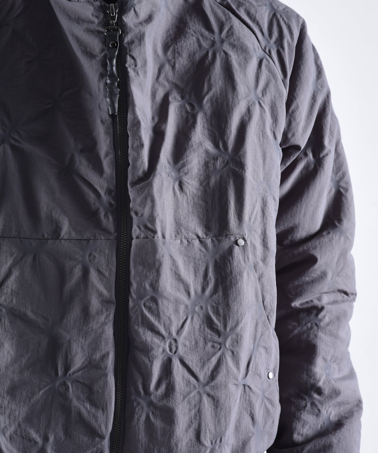天然繊維のような質感をもつナイロン素材に脈加工が施されたパフジャケット。