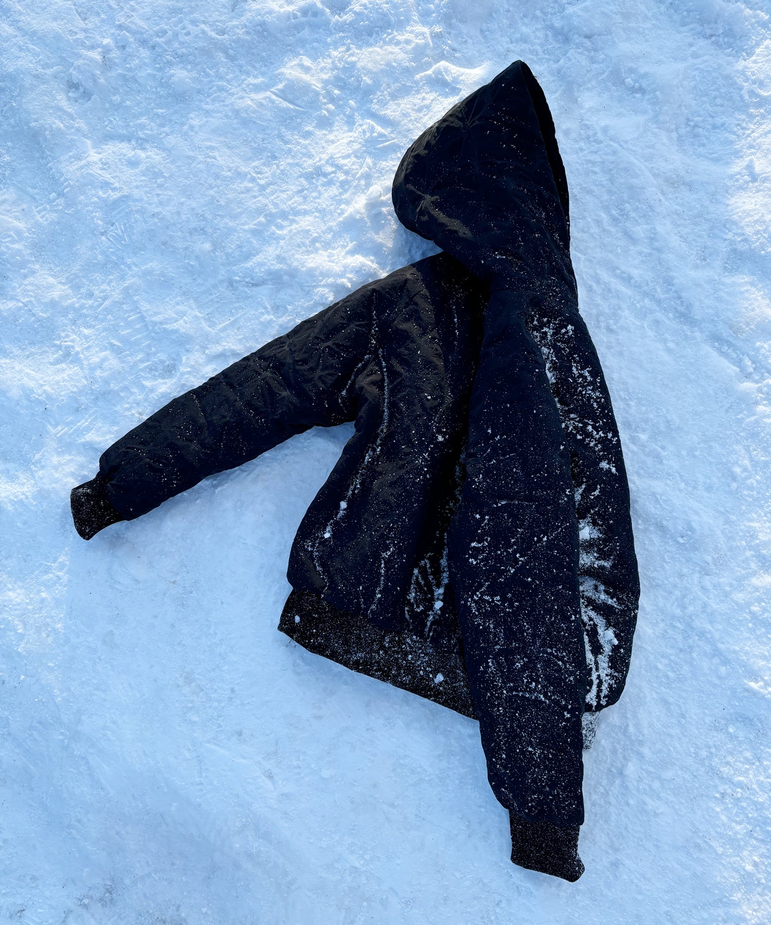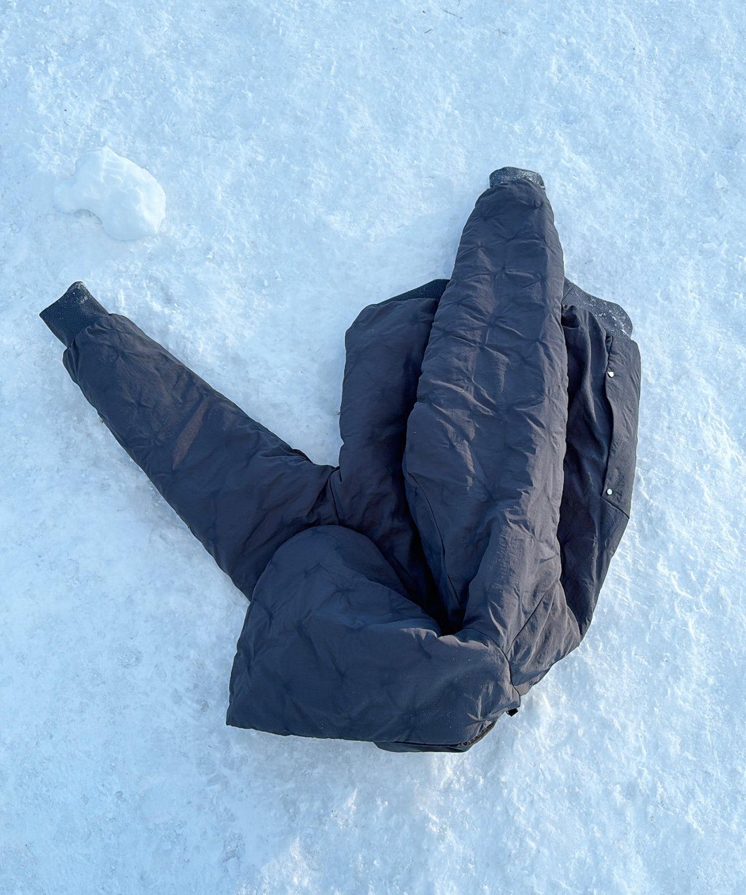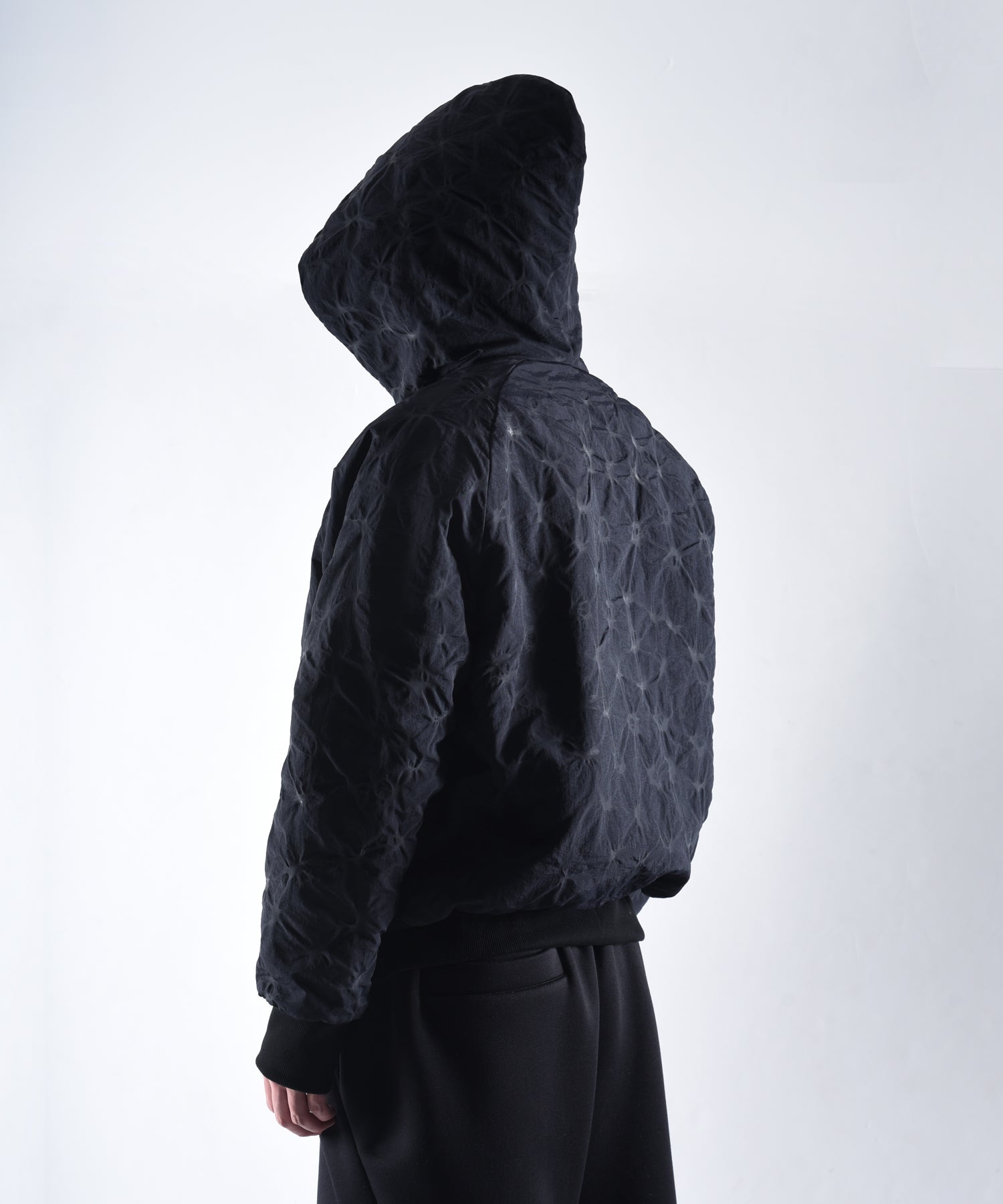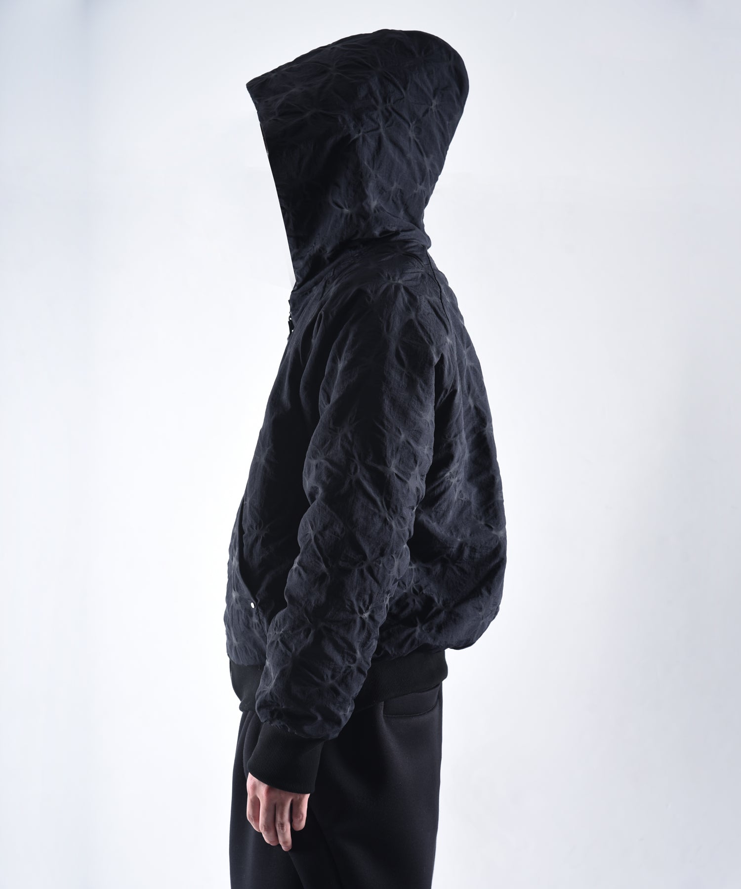 天然繊維のような質感をもつナイロン素材に脈加工が施されたパフジャケット。
