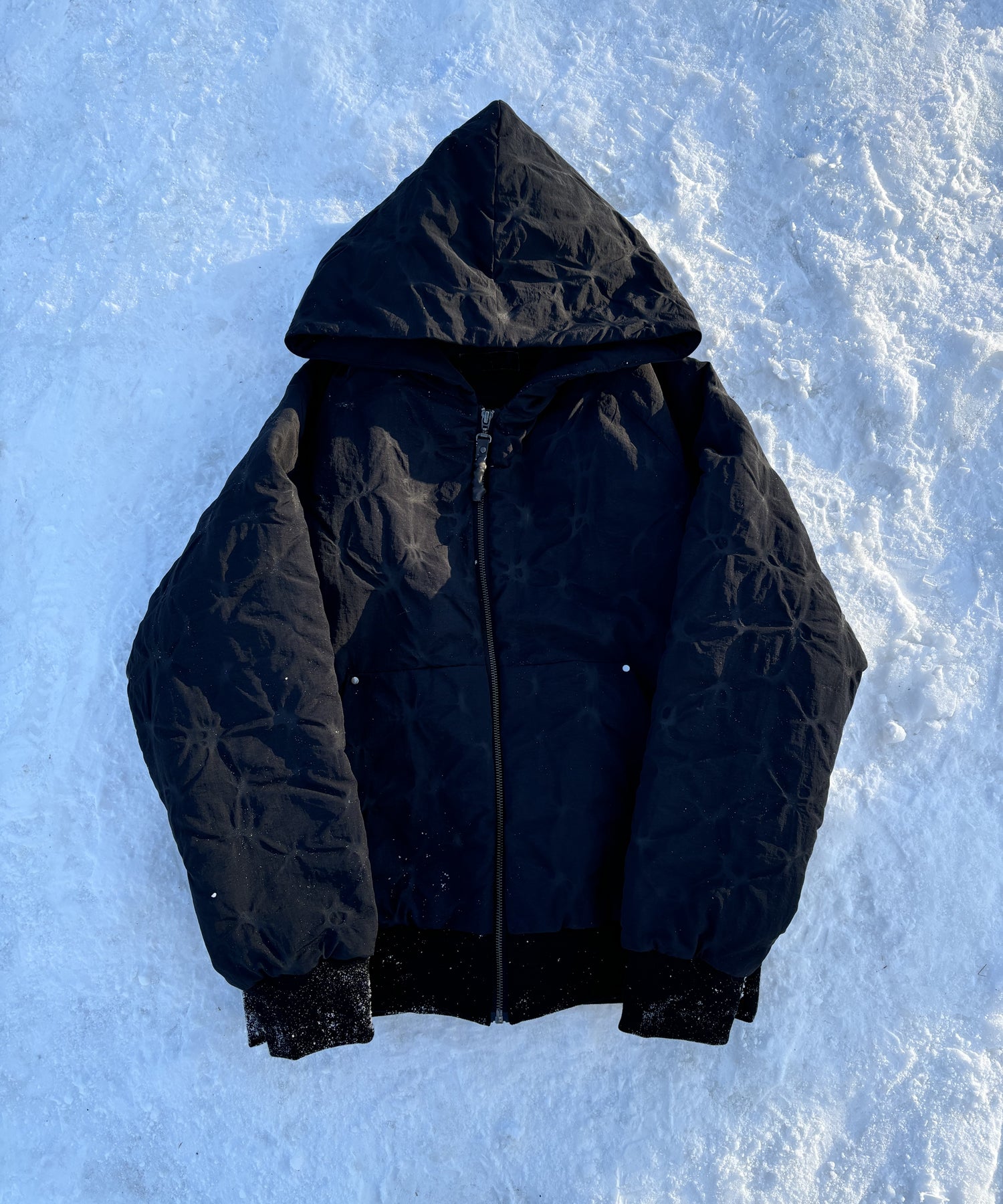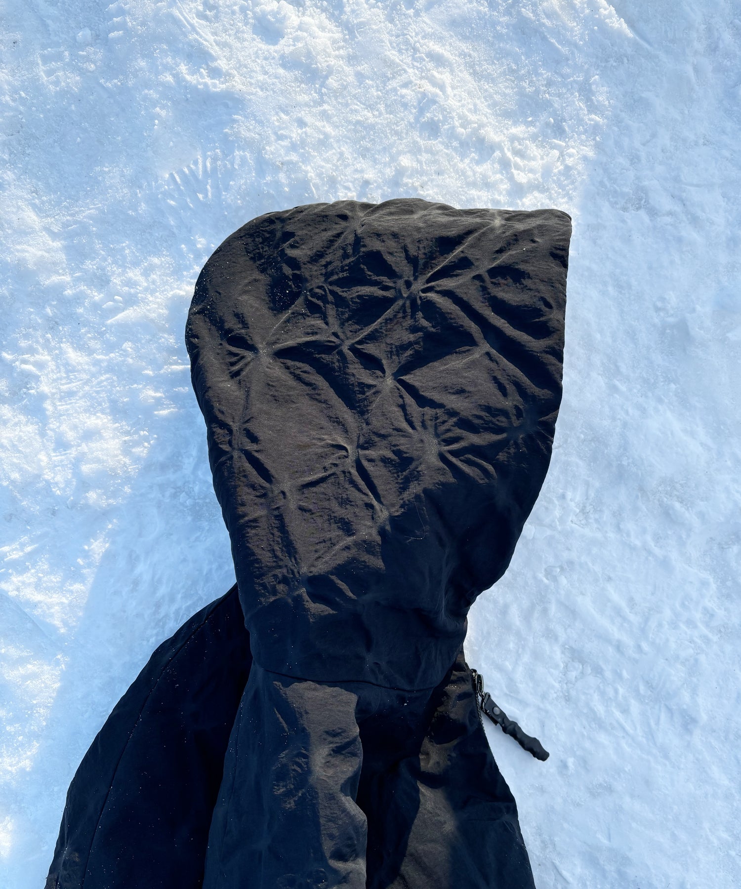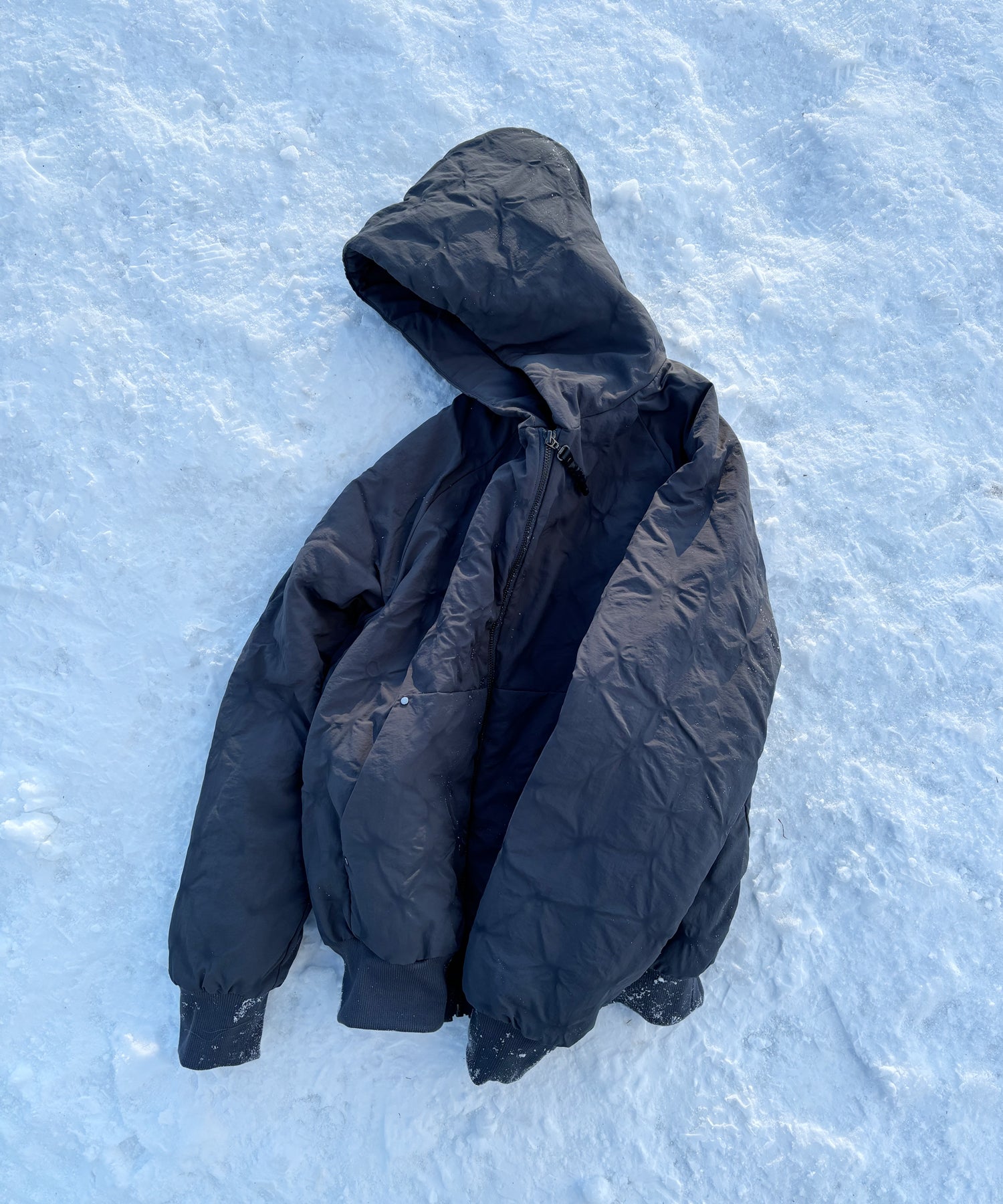 A puffer jacket made of nylon material with a texture similar to natural fibers with veining.